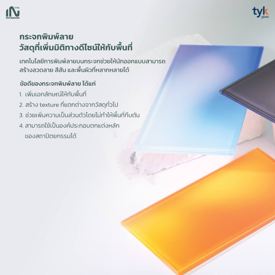 หนึ่งในวัสดุที่ได้รับความนิยมมากขึ้นในงานตกแต่งภายในคือ กระจกพิมพ์ลาย (Decorative Printed Glass) ซึ่งเทคโนโลยีการพิมพ์ลายบนกระจกช่วยให้นักออกแบบสามารถสร้างลวดลาย สีสัน และพื้นผิวที่หลากหลายได้ โดยยังคงคุณสมบัติของกระจกเอาไว้ เช่น ความโปร่งใสและการสะท้อนแสง