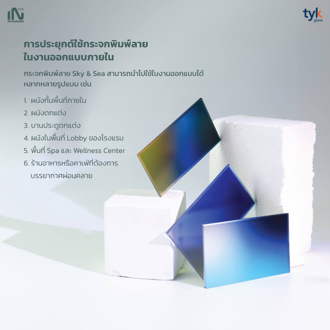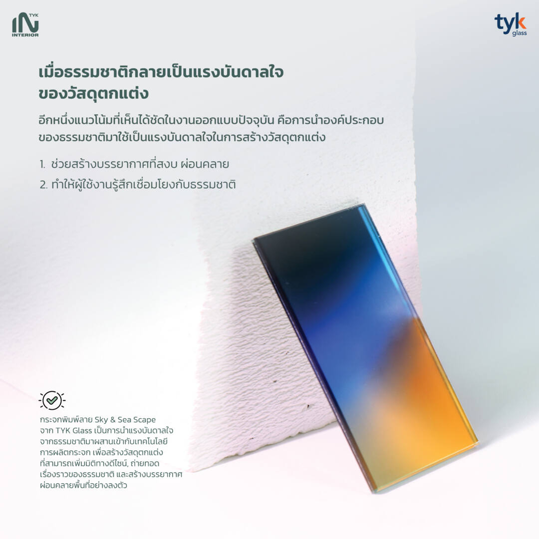 กระจกพิมพ์ลาย Sky & Sea Scape จาก TYK Glass เป็นตัวอย่างของวัสดุที่นำแรงบันดาลใจจากธรรมชาติมาผสานเข้ากับเทคโนโลยีการผลิตกระจก เพื่อสร้างวัสดุตกแต่งที่สามารถเพิ่มมิติทางดีไซน์, ถ่ายทอดเรื่องราวของธรรมชาติ และสร้างบรรยากาศที่ช่วยส่งเสริมความผ่อนคลายของพื้นที่