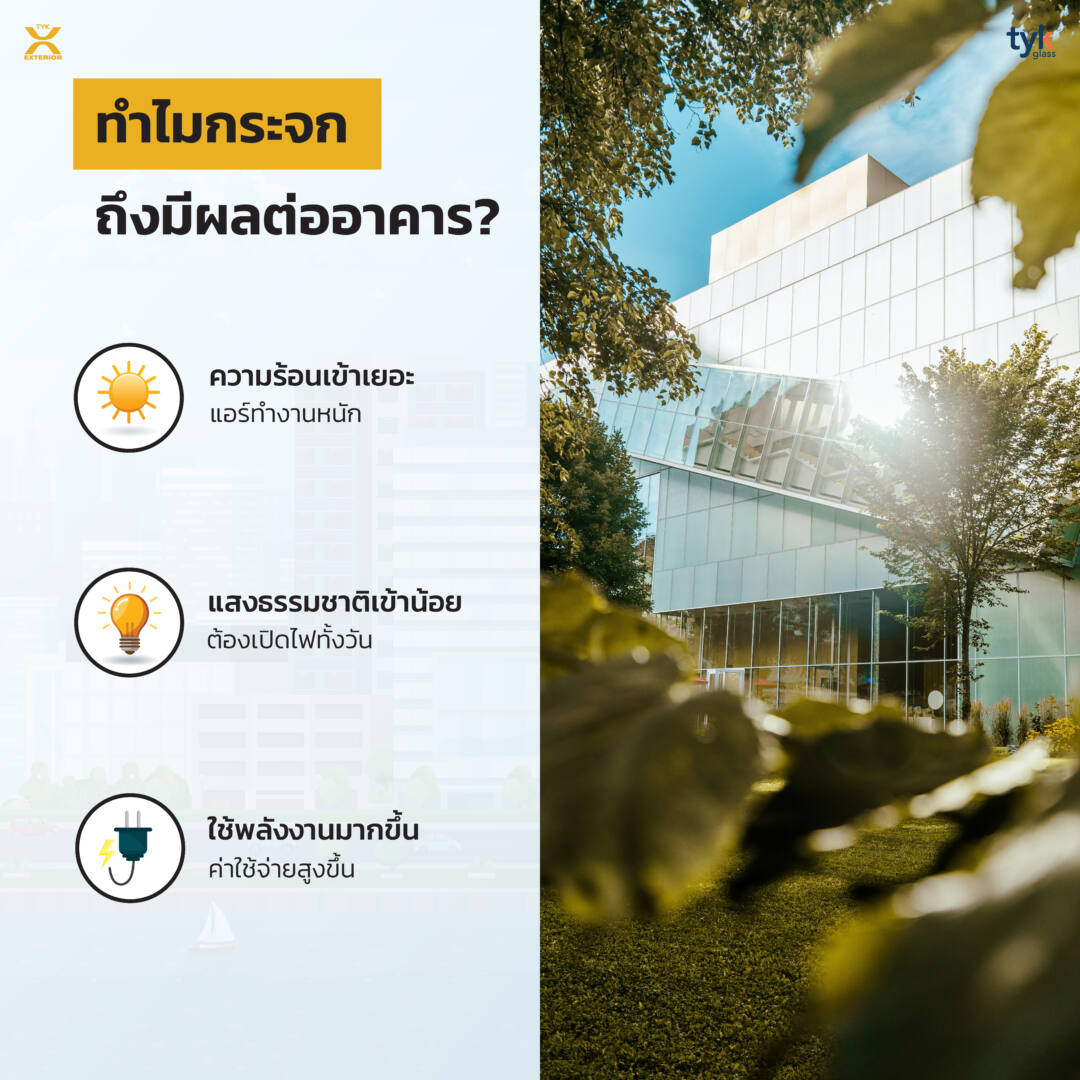 กระจกคือวัสดุที่เชื่อมปฏิสัมพันธ์ระหว่างภายนอกและภายในอาคารมากที่สุด ทั้ง แสงแดด ความร้อน การมองเห็น และสุนทรียภาพ ล้วนเริ่มจากช่องเปิด ดังนั้นหากเลือกกระจกผิด อาจมีผลลัพธ์ด้านลบตามมามากขึ้น ไม่ว่าจะเป็น