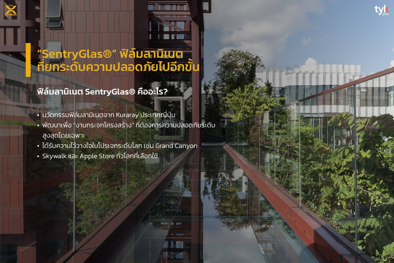 TYK Glass ได้นำเทคโนโลยีนี้มาพัฒนาเป็น กระจกลามิเนตโครงสร้าง Strengthglas ที่ใช้ฟิล์ม SentryGlas® จาก Kuraray เพื่อตอบโจทย์งานในด้านต่างๆ อาทิเช่น