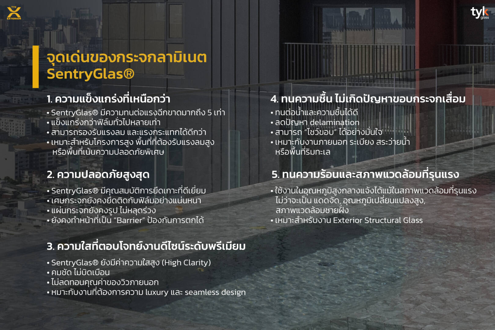 การเลือกใช้กระจกลามิเนตที่ใช้ SentryGlas® จึงไม่ใช่แค่ “สเปกที่ดีกว่า” แต่คือ การยกระดับมาตรฐานของทั้งโครงการ