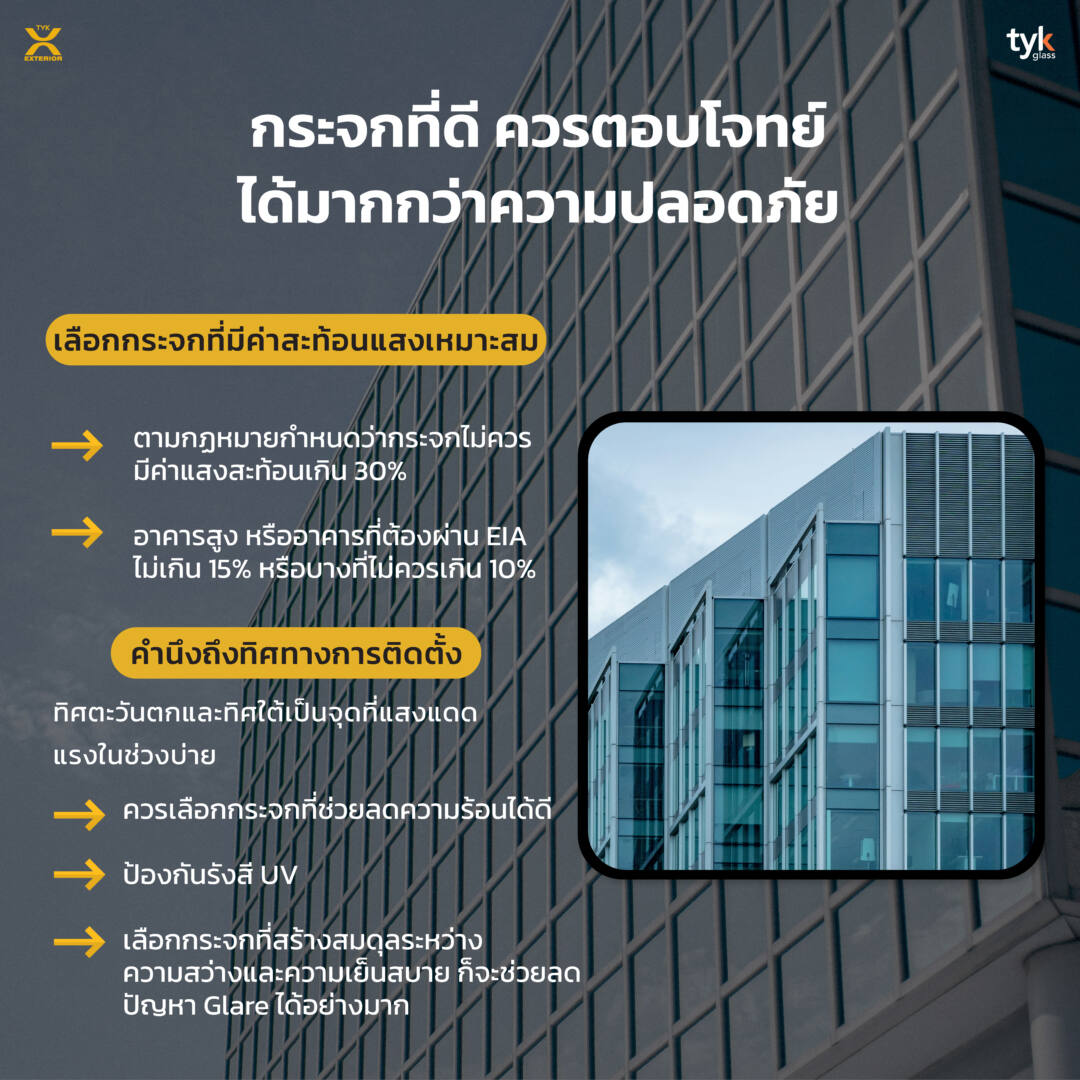 ซึ่งในปัจจุบัน เทคโนโลยีการผลิตกระจกก้าวไกลกว่าเดิมมาก สำหรับ TYK Glass ก็มีตัวเลือกค่า Performance หลากหลายที่นักออกแบบ สถาปนิก รวมถึงผู้ใช้งานสามารถ ปรับแต่งกระจก (Customize Glass Performance) ได้ตามความต้องการ เช่น