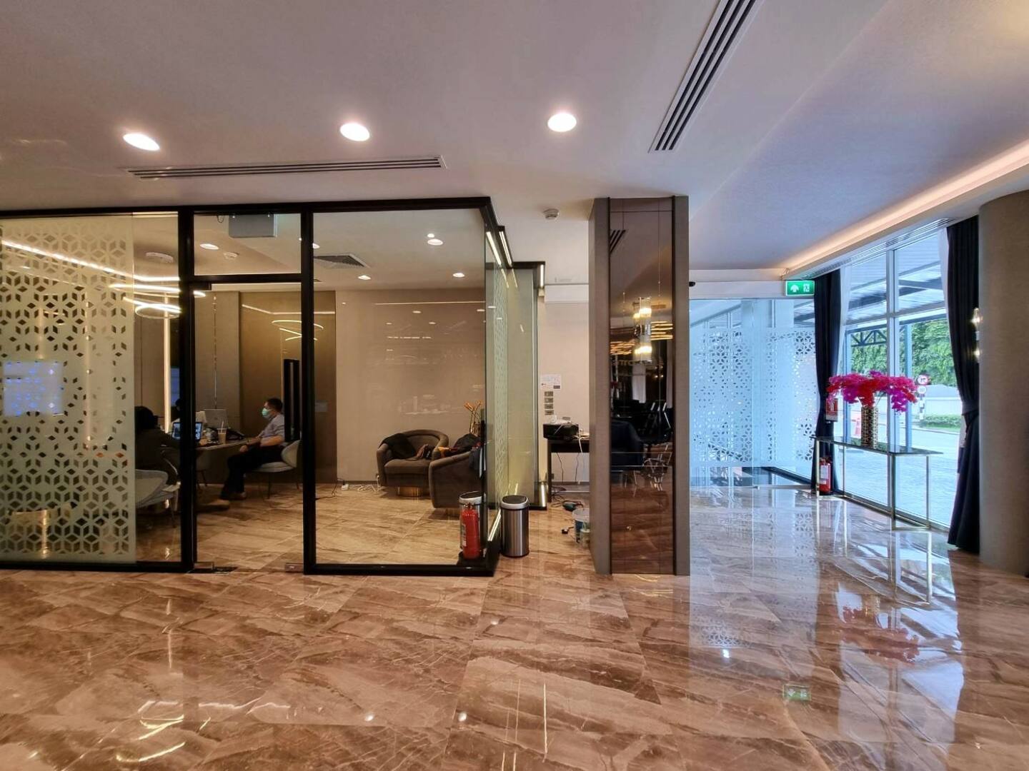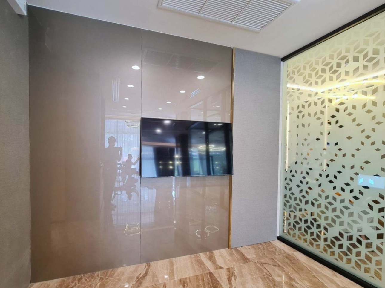 นอกจากนี้ยังมีการใช้ กระจกเคลือบสี Colorkote ในงานกรุผนัง ซึ่งช่วยเพิ่มความเรียบเนียนของพื้นผิว พร้อมสะท้อนความเงางามที่ช่วยยกระดับบรรยากาศของพื้นที่ให้ดูหรูหราและทันสมัยมากยิ่งขึ้น