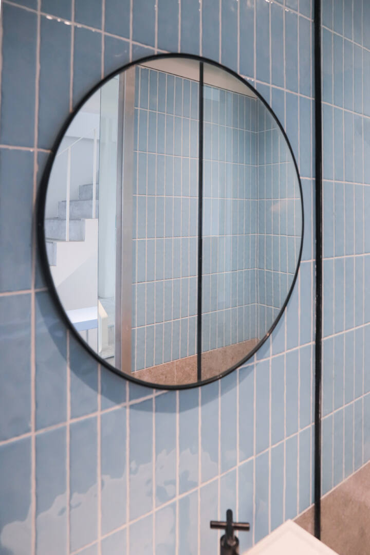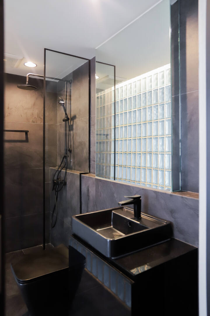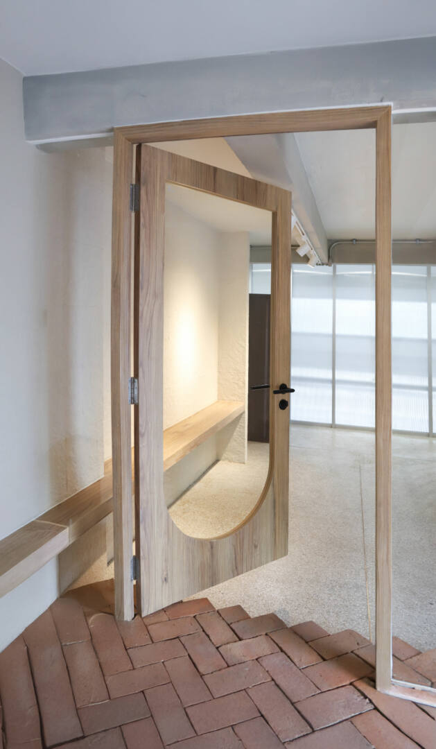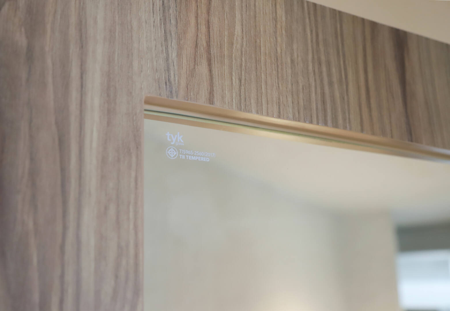 เพิ่มลูกเล่นพิเศษให้กับหน้าบานประตูด้วยดีไซน์ทรงโค้งบริเวณด้านล่าง พร้อมเลือกใช้กระจกนิรภัยเทมเปอร์ เพื่อเสริมความปลอดภัย และเพิ่มความโปร่งให้พื้นที่โดยรวมดูเบาสบายมากยิ่งขึ้น