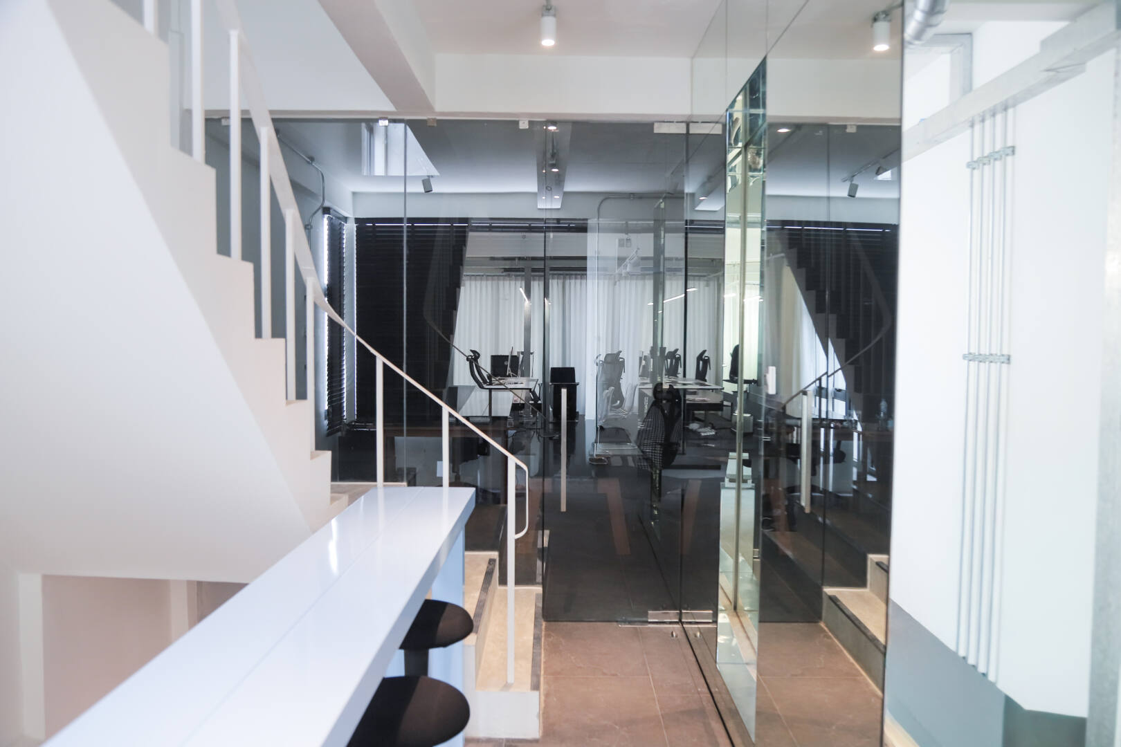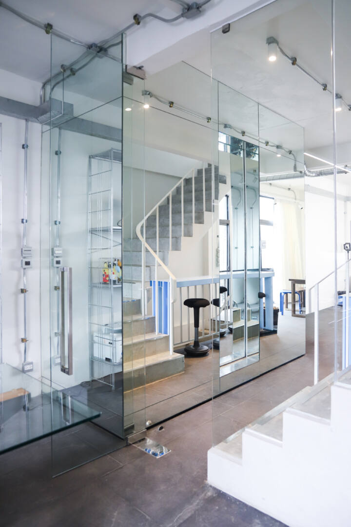 ถัดมาที่โซนห้องทำงาน ได้เพิ่มมิติให้พื้นที่ดูโปร่งโล่งด้วยผนังกั้นห้องกระจกใสเทมเปอร์ที่สามารถมองทะลุผ่านได้อย่างชัดเจน ผสานกับกระจกเงาใสที่เข้ามาสร้างมิติสะท้อน ทำให้พื้นที่โดยรอบดูกว้างขวาง โปร่ง และสบายตายิ่งขึ้น