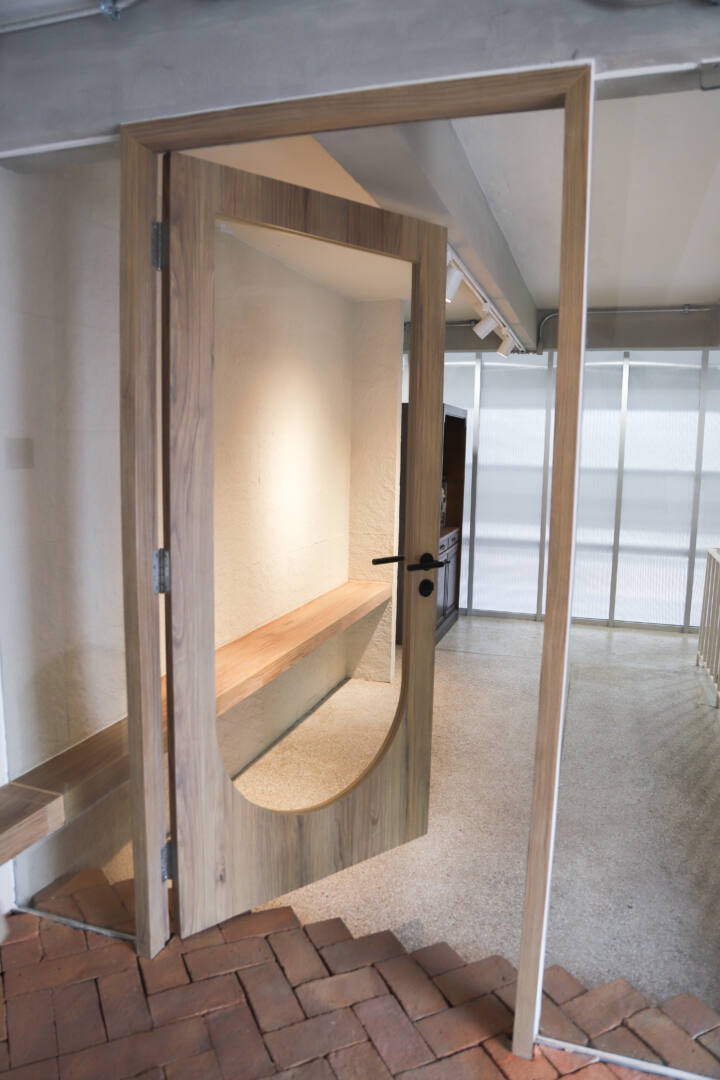 เพิ่มลูกเล่นพิเศษให้กับหน้าบานประตูด้วยดีไซน์ทรงโค้งบริเวณด้านล่าง พร้อมเลือกใช้กระจกนิรภัยเทมเปอร์ เพื่อเสริมความปลอดภัย และเพิ่มความโปร่งให้พื้นที่โดยรวมดูเบาสบายมากยิ่งขึ้น