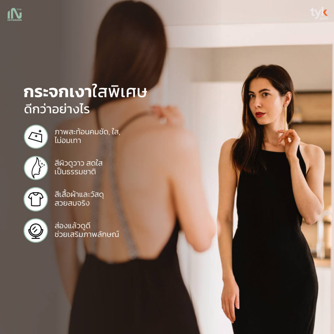 กระจกเงาใสพิเศษถูกพัฒนาขึ้นเพื่อยกระดับคุณภาพของภาพสะท้อนให้ คมชัด ใส และไม่อมเทา มากกว่ากระจกเงาทั่วไป เมื่อส่องกระจกเงาใสพิเศษ ภาพที่เห็นจะดูวาวขึ้น สีผิวดูสว่างเป็นธรรมชาติ สีของวัสดุและเสื้อผ้าถูกถ่ายทอดออกมาได้ใกล้เคียงความจริงมากขึ้น จึงไม่แปลกที่กระจกประเภทนี้มักถูกเลือกใช้ในพื้นที่ที่ “ภาพลักษณ์” คือหัวใจสำคัญ