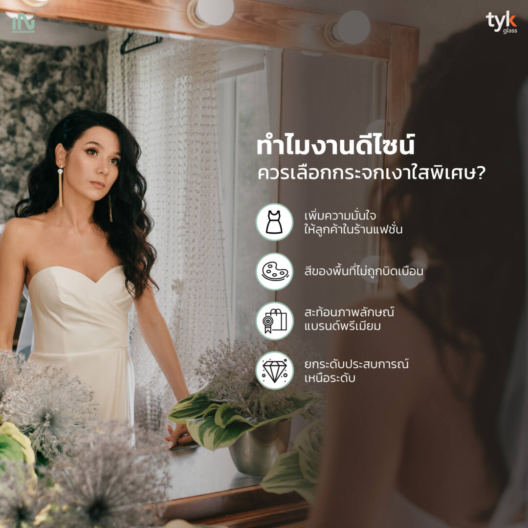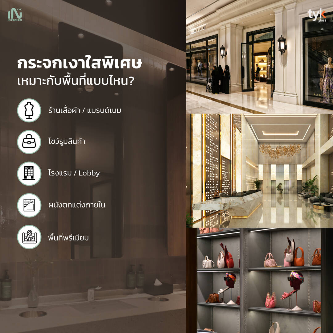 ไม่ว่าจะเป็นร้านแฟชั่นแบรนด์เนม โชว์รูมสินค้า พื้นที่ต้อนรับ หรือแม้แต่การตกแต่งผนังภายใน กระจกเงาใสพิเศษไม่ได้ทำหน้าที่แค่สะท้อนภาพ แต่กลายเป็นองค์ประกอบที่ช่วยเสริมความงามให้กับทั้งคนและพื้นที่